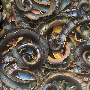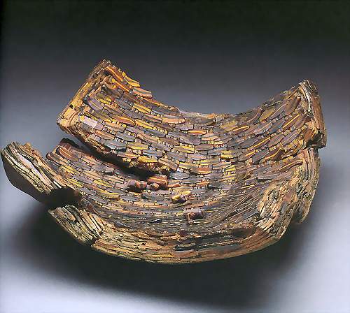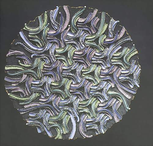 ´ÙÀ½ °úÁ¤À¸·Î »ö¼ÒÁö¸¦ ¸¸µå´Âµ¥, À̰ÍÀº ¹é»öµµ°¡ ³ôÀº ÀÚ±âÅä¿¡ »êȹ° ¶Ç´Â ½ºÅ×ÀÎÀ» ÀÛ¾÷¿¡ ÇÊ¿äÇÑ »ö»ó¿¡ ¸Â°Ô ¾ç(3¡20%)À» Á¶ÀýÇØ°¡¸ç ¹°°ú ¼¯¾î ¹ÝÁ×À» ÇÑ´Ù. ÀÌ ¶§ ¿À·£ ½Ã°£µ¿¾È ¹ÝÁ×ÇÏ¿© ¾È·á¿Í ÈëÀÌ °í·ç ¼¯ÀÌ°Ô ÇÏ´Â °ÍÀÌ Áß¿äÇÏ´Ù. ¹ÝÁ×ÀÌ ³¡³ª¸é ÆÐÅÏ ½ºÄÉÄ¡¿Í µ¿ÀÏÇÏ°Ô »ö¼ÒÁö¸¦ Á¶ÇÕÇÑ´Ù.(ÀÌ °úÁ¤Àº ¼¶À¯ÀÛ¾÷¿¡¼ ŸÇǽºÆ®¸®¸¦ Â¥´Â °úÁ¤°ú ºñ½ÁÇÏ´Ù.) »ö¼ÒÁö¸¦ Á¶ÇÕÇÒ ¶§ °ã°ãÀÌ »çÀÌ¿¡ ³Ö¾î ÀÏÁ¤ÇÑ ÆÐÅÏÀ» ¸¸µé±âµµ ÇÏÁö¸¸ ¿øÇÏ´Â ¸ð¾çÀ̳ª Å©±â´ë·Î Àß¶ó ¶Ç ´Ù¸¥ ÆÐÅÏÀ» ¸¸µé±âµµ ÇÑ´Ù. ±×³à´Â Ç×»ó ÀǵµÀûÀ¸·Î ÇÊ¿äÇÑ ÆÐÅÏÀÇ ¾çº¸´Ù ´õ ¸¹ÀÌ ¸¸µå´Âµ¥ ÀÌ·¸°Ô ÇÏ´Â ÀÌÀ¯´Â ³²°ÜÁø Á¶°¢µéÀÌ ´ÙÀ½ ÀÛ¾÷À¸·ÎÀÇ Àü°³¿Í »õ·Î¿î »ý°¢À» °¡Á®´Ù Áֱ⠶§¹®À̶ó°í ÇÑ´Ù. »þ¸ðÆ®°¡ ¼¯ÀÎ ¼®±âÁ¡Åä(stoneware c1ay)¸¦ ±âÃÊÇüÅ·ΠÇÏ¿© ±× À§¿¡ Á¶ÇÕµÈ »ö¼ÒÁö¸¦ ¾ã°Ô ½ä¾î ºÙÀ̴µ¥ ³ô³·À̸¦ ´Þ¸®ÇØ ÀÔü°¨À» Áֱ⵵ ÇÑ´Ù. ¼®±âÁ¡Åä¿Í ÀÚ±âÅäÀÇ ´Ù¸¥ ¼öÃà·ü ¶§¹®¿¡ ¼Ò¼º½Ã ±â¼úÀûÀÎ ¹®Á¦°¡ µû¸£Áö¸¸ Àڱ⸦ ÃÖ´ëÇÑ ¾ã°Ô ÇÔÀ¸·Î½á ±Øº¹ÇÑ´Ù.