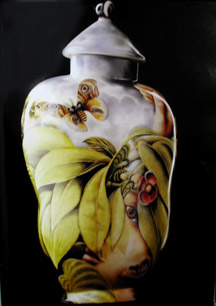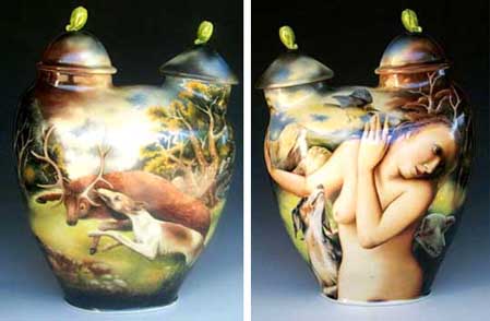 ĿƮ¿ÍÀÌÀúÀÇ ÀÛǰÀº Â÷À̳ª ÆäÀÎÆ®(china paint)·Î ±×·ÁÁö´Âµ¥ À̰ÍÀº Á÷Á¢ÀûÀ¸·Î ÇüÅÂ¿Í °ü·ÃÀÌ ÀÖ´Ù. ĿƮ ¿ÍÀÌÀú°¡ µå·ÎÀ×À» ÇÏ°Ô µÈ ¹è°æÀ» ¾Ë¾Æº¸ÀÚ. ±×´Â ÀÌÁýÆ®¿Í Áß³²¹Ì¸¦ ¿©ÇàÇÏ¸ç ±×¸° 19¼¼±â ¿µ±¹°ú ÇÁ¶û½ºÀÇ ¿¹¼ú°¡µéÀÇ ±×¸²À» º¸°í, µ¿¾çÀÇ ±×¸²ÀÌ °¡Áø Ư¡¿¡ ¸Å·áµÇ¾î ºñ½Á ÇÑ µå·ÎÀ× ±â¹ýÀ» »ç¿ëÇÏ°Ô µÇ¾ú´Ù. ÀÌ·¯ÇÑ ±×¸² ¼Ó¿¡ ¸¹Àº À̾߱Ⱑ ÀÖ´Ù´Â °ÍÀ» ¹ß°ßÇÏ°í µå·ÎÀ׿¡ ´ëÇÑ Èï¹Ì¸¦ °®±â ½ÃÀÛÇß´Ù. ±× ·¡¼ ±×´Â ¸¹Àº °ÍÀ» ¸¸µé¾î³»´Â °Íº¸´Ù ÀÛ°í ¼¼¹ÐÇÑ ºÎºÐ¿¡ ÃÊÁ¡À» ¸ÂÃ߱⠽ÃÀÛÇß´Ù. ĿƮ¿ÍÀÌÀú°¡ ŸÀ̸¦ ¿©ÇàÇßÀ» ¶§, Â÷À̳ª ÆäÀÎÆ®¸¦ ÅëÇØ ±× ³ª¶óÀÇ ¹°ÁúÀûÀÎ ¾Æ¸§´Ù¿ò°ú ½Ä¹°, µ¿¹°À» Ç¥ÇöÇÑ °ÍÀ» º» ÈÄ ±×ÀÇ ÀÛ ¾÷Àº »öÀÌ º¯ÈÇÏ°Ô µÈ´Ù. Â÷À̳ª ÆäÀÎÆ®±â¹ýÀº ¸¹Àº ½ÇÇèÀÌ ÇÊ¿äÇß´Ù. ¶Ç, °í¿Â¼Ò¼ºÀÌ ¾Æ´Ï¶ó ³·Àº ¿ÂµµÀÇ Àú¿Â¼Ò¼ºÀÌ ÇÊ¿äÇß´Ù. ĿƮ ¿ÍÀÌÀú´Â ¹éÀÚ¼ÒÁö¸¦ »ç¿ëÇÏ¿© ±â¸¦ ¸¸µç ´ÙÀ½ Åõ¸íÀ¯¸¦ ¹ß¶ó 1300¡Æ(cone 10)·Î ¼Ò¼ºÀ» ÇÑ ÈÄ Â÷À̳ª ÆäÀÎÆ®·Î ±×¸²À» ±×¸°´Ù. ¸çÄ¥ ¶Ç´Â ¸î ´Þ¾¿ ¼Ò¿äµÇ ´Â ¿À·£ ½Ã°£À» µé¿© ¼¼¹ÐÇÏ°Ô ±×¸²À» ±×·Á 750¡Æ(cone 018)·Î ¼Ò¼º ÇÑ´Ù. ±×´Â µå·ÎÀ×À» ¿©·¯ ¹ø ´Ù½Ã ¼öÁ¤Çϰųª Àç¼Ò¼ºÇÏ¿© Á¤±³ ÇÏ°Ô µå·ÎÀ×À» Çϴµ¥ Æò±ÕÀûÀ¸·Î ¿øÇÏ´Â µå·ÎÀ×À» ¾ò±â À§ÇØ ¾à ´Ù¼¸ ¹ø Á¤µµÀÇ ¼Ò¼ºÀ» ÇÑ´Ù. µå·ÎÀ×ÀÇ »ö¿¡ µû¶ó ¿ÂµµÀÇ º¯È¸¦ Áֱ⵵ ÇÑ´Ù. ±×´Â Á÷Á¢ ¼ÕÀ¸·Î ±×¸²À» ±×¸®°í, ±×ÀÇ ÀÛ¾÷Àº º¹ÀâÇÏ°Ô ÁøÇàµÈ´Ù. ĿƮ ¿ÍÀÌÀúÀÇ ÀÛǰÀº µå·ÎÀ×ÀÇ »ö¿¡ µû¶ó ¼Ò¼º¿Âµµ°¡ ´Þ¶óÁø´Ù. ±×·¡¼, Â÷°¡¿î »ö°ú ¶ß°Å¿î »öÀ¸·Î ¾ö°ÝÇÏ°Ô »öÀ» ±¸ºÐÇÏ¿© µå·ÎÀ× À» ÇÑ´Ù. ±×°ÍÀº Á÷°ü¿¡ ÀÇÇØ¼´Â ¿Ïº®ÇÑ À̹ÌÁö°¡ ¸¸µé¾îÁú ¼ö ¾ø´Ù´Â °ÍÀ» º¸¿©ÁÖ´Â °ÍÀÌ´Ù. ¸ðµç ÇüÅÂ¿Í »öÀº ¹Ì¸® °áÁ¤µÇ°í ÀÌ·¯ ÇÑ °èȹ¿¡ µû¶ó ÀÛ¾÷À» ÇÏ°Ô µÇ´Â °ÍÀÌ´Ù. ÀÌ·¯ÇÑ »öÀÇ »ç¿ëÀº Á¤¹ÐÇÏ°Ô ½Ä¹°ÀÇ ÀÙÀ» ±×¸®°Ô µÊÀ¸·Î½á, ºñÀ¯Àû »ó¡À» ´ã¾Æ Ç¥ÇöÇÒ¼ö ÀÖ°Ô ÇÏ¿´´Ù. (µµÆÇ12) ºÎµå·¯¿î »öÁ¶º¸´Ù »öÀÇ °¾àÀÌ ÀÖ´Â ÀÎüÀÇ Ç¥ÇöÀº ¼ºÀûÀΠǥÇöÀ» µûºÐÇÏÁö ¾Ê°Ô ¸¸µç´Ù.(µµÆÇ13)