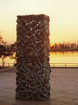 ÈëÀÇ ¹°¼º°ú Å©±âÀÇ ÇѰ踦 ¶Ù¾î³Ñ´Â ¾î·Á¿î °úÁ¤À» °ÅÃÄ ¿Ï¼ºµÇ´Â ±×ÀÇ È¯°æ µµÁ¶´Â ¿ì¼± ±â¹ý°ú Àç·á ¹®Á¦¸¦ ÇØ°áÇØ¾ß¸¸ °¡´ÉÇÏ´Ù. ÀÚ½ÅÀÌ ¸¸µç Á¶ÇÕÅäÀÇ °³¹ßÀº ¹°·Ð »êȼҼº¿¡ ÀÇÇÑ ±â¼úÀû ¾î·Á¿òÀ» ±Øº¹ÇØ¾ß ÇÏ´Â °ÍÀÌ´Ù. ÀåÀå 50¿© ½Ã°£ÀÌ °É¸®´Â Ãʹú°ú Àç¹ú °úÁ¤À» ¼ÒȽÃ۰í, °ø°£ Å©±â¿¡ ¸ÂÃç ȯ°æ°ú Á¶È¸¦ ÀÌ·é´Ù. ´ç½Ã Á¦ÀÛµÈ ÀÛǰÀº 2003³â Á¦10ȸ °³ÀÎÀü¿¡ <¼¼Æ÷Á¶Á÷(Cellulation)> À̶ó´Â Á¦¸ñÀ¸·Î ¹ßÇ¥ÇÏ¸é¼ È¯°æµµÁ¶ÀÇ ´ëÇ¥ÀÛÀ¸·Î ¼Ò°³µÈ´Ù. ¿©±â¼ Èûµç ±â¼úÀû ¹®Á¦¸¦ ÇØ°áÇÑ ÀÛ°¡´Â µµ½Ã °ø°£¿¡ ¼³Ä¡ÇÏ¿© ȯ°æ¹Ì¼ú·Î ÀüȽÃŰ¸é¼ Çö´ë µµÀÚ¿¹¼úÀÇ ¿µ¿ªÀ» È®Àå½ÃÄÑ ³ª°¡´Â °ÍÀÌ´Ù.