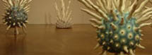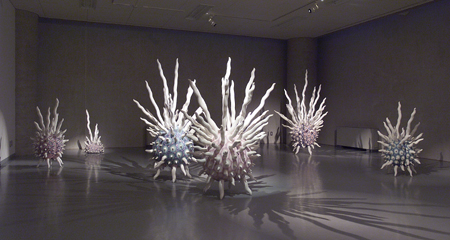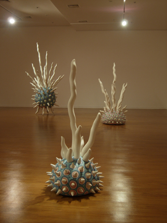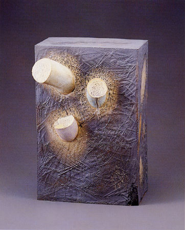 ¾ö¼ºµµ´Â ÀÌ·± ij½ºÆÃ °ø¹ýÀ» ¸Å°³·Î ÇÏ¿© ƯÀ¯ÀÇ Çü»óÀ» ºø¾î³½´Ù. °ø°£À» Á¡À¯Çϰí ÀÖ´Â ±× Çü»óµéÀº ºñÁ¤ÇüÀÇ ¿øÇüÀ» ¸öÅëÀ¸·Î ÇÏ¿© ±× Ç¥¸é¿¡ ¸¶Ä¡ ¿øÇü»ý¹°ÀÇ °¨°¢Ã˼ö¿Íµµ °°Àº ¹«¼öÇÑ µ¹±âµéÀÌ ³ª ÀÖ´Ù. ÀÌ·± ÇÏ¾á µ¹±âµé°ú ÇÔ²² ¸öÅëÀÇ Ç¥¸é¿¡´Â û»ö°ú ºÐÈ«»öÁ¶ÀÇ ¾ó·è ¹ÝÁ¡µéÀÌ ³ª ÀÖ¾î¼ ÇÑ´«¿¡µµ »ì¾ÆÀÖ´Â À¯±âü¸¦ ¿¬»ó½ÃŲ´Ù. ÀÌ´Â ¸¶Ä¡ ¿øÇü»ý¹°µéÀÌ ½Ã°£ÀÌ Á¤ÁöµÈ µí Á¤ÀûÀÎ ¾ÏÈæ ¼ÓÀ» À¯¿µÇϴ Ű÷Àû dz°æ°ú ´ë¸éÄÉ ÇÑ´Ù. ¸»ÇÏÀÚ¸é ±× ÀÚü Áß¼ºÀûÀÌ°í °¡Ä¡Á߸³ÀûÀÎ Àü½Ã°ø°£¿¡´Ù ƯÁ¤ÀÇ ¼º°ÝÀ» ºÎ¿©ÇÏ¿© À̸¦ ÀÏÁ¾ÀÇ »óȲÀû °ø°£ ȤÀº ¼»çÀû °ø°£À¸·Î º¯Çü½Ã۰í ÀÖ´Â °ÍÀÌ´Ù. ÀÌ·¯ÇÑ °ø°£Àû Á¡À¯¾ß¸»·Î Á¶Çü¿¹¼úÀÇ Áß¿äÇÑ ¹®¹ý Áß ÇϳªÀ̸ç, ÀÛ°¡´Â À̸¦ ÅëÇØ »ý¸íÀ» À×ÅÂÇϰí ÀÖ´Â ¿ìÁÖÀû Àڱà ¼ÓÀ¸·Î °ü°´À» ÀεµÇÑ´Ù. º¸±â¿¡ µû¶ó¼ µ¹±â Çü»óÀº ¸öÅë ³»ºÎ·ÎºÎÅÍÀÇ ¿¡³ÊÁöÀÇ ºÐÃâÀ̳ª ±âÀÇ ¹æÃâÀ» »ó±â½Ã۸ç, ÀÌ ¿ª½Ã ÀÛ°¡ÀÇ ÀÛ¾÷À» °üÅëÇÏ´Â ÁÖÁ¦ÀǽÄÀÎ »ý¸í ȤÀº »ý¸í·ÂÀÇ Ç¥Ãâ°ú ÅëÇÑ´Ù.