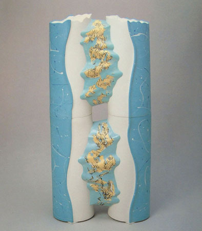 ÀÛǰÀÌ °¡Áö°í ÀÖ´Â ÄÁ¼ÁÀº »ý¸íüÀÇ ±Ù¿øÀûÀΠȰµ¿¿¡ ´ëÇÑ Á¶ÇüÈÀ̸ç Á¦ÀÛ±â¹ýÀº Áö±ØÈ÷ Çö´ëÀûÀÎ ¹æ¹ýÀ» ÃëÇ쵂 ±× ±Ù¿øÀº Çѱ¹ÀÇ ÀüÅë »ó°¨±â¹ý¿¡ ±× »Ñ¸®¸¦ µÎ°í ÀÖ´Ù. »ö ½½¸³À» ¼®°í »ç¿ëÇüÀÇ ³»ºÎ¿¡ ¾×¼Ç ÆäÀÎÆÃó·³ ¶³¾î¶ß¸®°Å³ª Èð»Ñ·Á¼ ÀÚÀ¯·Î¿î °î¼±ÀÌ ÃãÀ» Ãßµí µå·¯³ª°Ô Çϰí, »ýÅ©¸² ÄÉŸåÀ» ¸¸µé µí ¿©·¯ º° ¸ð¾çÀÇ ³ëÁñÀ» ÅëÇØ¼ ½½¸³À» Áã¾î Â¥³»°Ô µÇ¸é ¾ÆÁÖ ¼¼¹ÐÇÑ ºÎºÐÀ» °¡Áø ÅØ½ºÃò¾î°¡ °¡´ÉÇØ Áø´Ù. ±× À§¿¡ ´Ù¸¥ »ö»óÀÇ »ö ½½¸³À» µÎ²®°Ô ÀÔÇô¼. ÇÊ¿äÇÑ ºÎºÐÀ» ³²±â°í ¿©ºÐÀÇ ½½¸³Àº Á¦°ÅÇÑ´Ù. ÀÌ·± °úÁ¤À» ¹Ýº¹ÇÏ¿© ½ÃÇà ÇÔÀ¸·Î¼ ÀÚ¿¬ÀûÀÎ °î¼±°ú ÀÎÀ§ÀûÀÎ ¹®¾çÀÇ º§·±½º¸¦ Àß ¸ÂÃâ ¼ö ÀÖ´Ù. ¸¶Áö¸·Àº ¹é»ö ½½¸³À» ÁÖÀÔÇÏ°í °ÇÁ¶ ÈÄ Å»ÇüÀ» Çϸé ÀÛǰÀÇ Ç¥¸é¿¡ »ó°¨µÈ ¹®¾çÀÌ ³ªÅ¸³´Ù. ¼Ò¼º ÈÄ ´ÜÀ§Ã¼¸¦ »çÀü°èȹ¿¡ ÀÇÇØ¼ ¸ÂÃß¾î ½×¾Æ¿Ã¸®¸é ÀÛǰÀÇ Á¦ÀÛ°úÁ¤ÀÌ ³¡³´Ù 2°³ÀÇ ±âµÕÀÌ ¾çÂÊ¿¡ ¹öƼ°í ¼ÀÖ°í ±×»çÀ̸¦ ÆÄµµ Ä¡µí ¿þÀ̺갡 ÀÖ´Â ÇüŰ¡ ¿¬°áµÇ¾îÀÖ´Ù. ¸ðµç »ì¾ÆÀÖ´Â °ÍµéÀº À½°ú ¾çÀÇ ½ÖÀ¸·Î ÀÌ·ç¾îÁ® ÀÖ´Ù´Â Àǹ̷μ ±âµÕÀÌ ¼ÀÖ°í, ¿þÀ̺ê´Â ¼·ÎÀÇ ±³ÇÕÀ̳ª ¿Õ·¡ÀÇ ÀÇ¹Ì·Î ÇØ¼®ÀÌ °¡´ÉÇÏ´Ù. ÀûÃþÇÏ¿© Æ÷¸§À» Çü¼ºÇÏ´Â °Í¿¡ ÀÇÇØ ÁÖÀÔ¼ºÇüÀÌ °®´Â ½ºÄÉÀÏÀÇ °í¹ÎÀ» ÇØ°áÇÒ ¼ö ÀÖ°í °ø°£ Á¶Çü¹°·Î¼ÀÇ Á¸À缺À» È®º¸ÇÒ ¼ö ÀÖ´Ù.