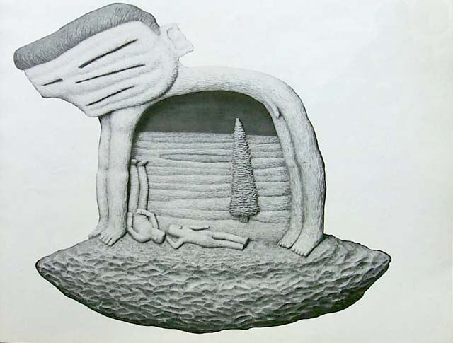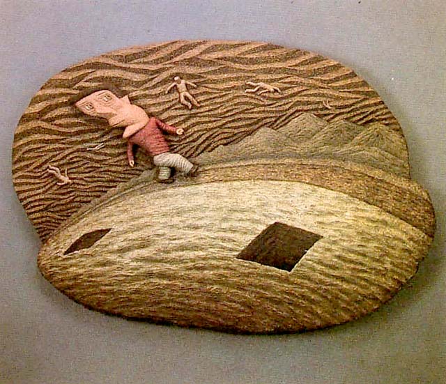 ±×¸² Two Worlds,35"x28"x5" 1987 ÀÌ »ç¶÷Àº Àǽİú ¹«ÀÇ½Ä »çÀ̸¦ ¿òÁ÷À̰í ÀÖ´Ù. ȦÄÞÀÇ ÃÖ±ÙÀÛǰ ´ëºÎºÐ¿¡¼ ÀÌ °æ°è¼±ÀÇ Å½±¸°¡ °è¼ÓµÇ°í ÀÖ´Ù.°ú°ÅÀÇ °ÆÁ¤Àº ½ÅÈ È¤Àº ²Þ ´Ù½Ã ¸»ÇØ Á×À½ ³Ê¸Ó·Î ¼û¾îÀÖ´ø ¼¼°è¿¡ °üÇÑ ±Ã±ÝÁõ(°ÅÀÇ È£±â½É)µé·Î ÇØ°áµÇ±â ½ÃÀÛÇÑ´Ù. ³ª¹«½£¿¡ ÀÇÇØ °¡·ÁÁø¾ð´öÀÇ Ãµ±¹ °°Àº dz°æÀº ¿ì¸®µé ¾Õ¿¡ ÆîÃÄÁ®ÀÖ´Ù. ±×¸®°í Áñ°Ì°Ô Àå³Ä¡°í ÀÖ´Â ¼¼¸íÀÇ ¿µÈ¥°ú °°Àº Çü»óµéÀÌ »ì°í ÀÖ´Ù. ¿ì¸®´Â ÀÌ Àå¸éÀÇ ¾Æ·¡ÂÊ Å׵θ®¸¦ µû¶ó È帣°í ÀÖ´Â Â÷°©°í ¾îµÎ¿î °¹° À§ Çϴÿ¡ ¶°ÀÖ´Ù.