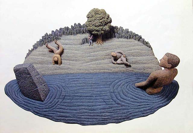 ¿ì¸®µé ¾Æ·¡·Î, ÇÑ ¹ú°Å¹þÀº ³²ÀÚ°¡ ÀÜÀÜÈ÷ È帣´Â ¹° °¡¿îµ¥¿¡ ¼¼ ±× ÀÛÀº Çü»óµéÀ» Á¶¿ëÈ÷ ¹Ù¶óº¸°í ÀÖ´Ù. ±× ¿·¿¡, ¸¶Ä¡ ´Ù¸¥ ½Ã´ë¸¦ ¾Ï½ÃÇÏ´Â °Í °°Àº »ç°¢ÇüÀÇ °ËÀº µ¹±âµÕÀÌ ¼ÀÖ´Ù. ±× »ç¶÷ÀÌ ÀÛÀº õ±¹ ¼ÓÀ¸·Î ³ª¾Æ°¥Áö ´ÜÁö ±×°ÍÀ» º¸±â¸¸ ÇÒÁö´Â ºÐ¸íÇÏÁö ¾Ê´Ù. ÀÌ °Àº ±ú¾îÀÖ´Â ¼¼°è¿Í Àáµé¾îÀÖ´Â ¼¼°è¸¦ ºÐ¸®½ÃÄÑÁÖ´Â °Í Áß ÇϳªÀÏÁöµµ ¸ð¸¥´Ù. ±×·¯³ª ±×°ÍÀº »ý°ú »ç¸¦ »çÀÌ¿¡ È帣´Â ½ºÆ½½º°(±×¸®½º½ÅÈ¿¡ ³ª¿À´Â Áö¿ÁÀÇ °) ÀÏÁöµµ ¸ð¸¥´Ù.
