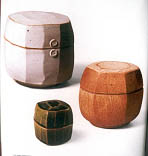Cut sided lidded boxes, white 1982, copper green glaze 1979, brown 1989 |